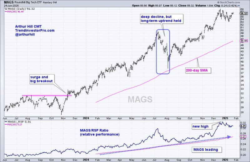 First and foremost, MAGS is in a long-term uptrend with a new high in mid December and price well above the 200-day SMA. This ETF has been in a long-term uptrend since the big surge and breakout in November 2023. MAGS started trading in April 2023 so the 200-day SMA did not start until late January 2024. MAGS fell sharply in July 2024, but held above the 200-day SMA and resumed its uptrend with a new high in November.