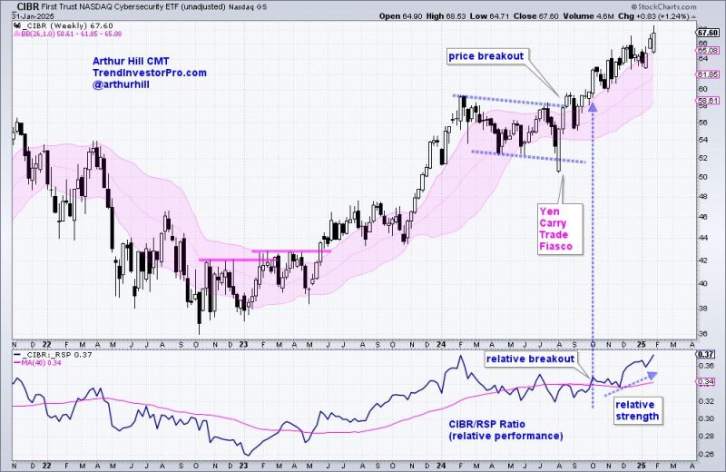 The first chart shows weekly candlesticks over the last three years. CIBR surged from November-2023 to January 2024 and then formed a long consolidation pattern from February to September. CIBR broke consolidation resistance at 58 in September (price breakout) and closed above 68 this week. This breakout opened to door to the current run.