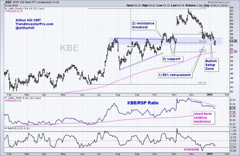Let’s first review the setup from mid January. The chart below shows KBE hitting a new high in late November and then falling into mid January. The new high affirms a long-term uptrend and KBE remained well above the rising 200-day SMA. Thus, this decline was viewed as a correction within a long-term uptrend. During such pullbacks, I look for Bullish Setup Zones using retracement levels, prior resistance breaks and support levels. These are zones to watch for firming and a reversal.