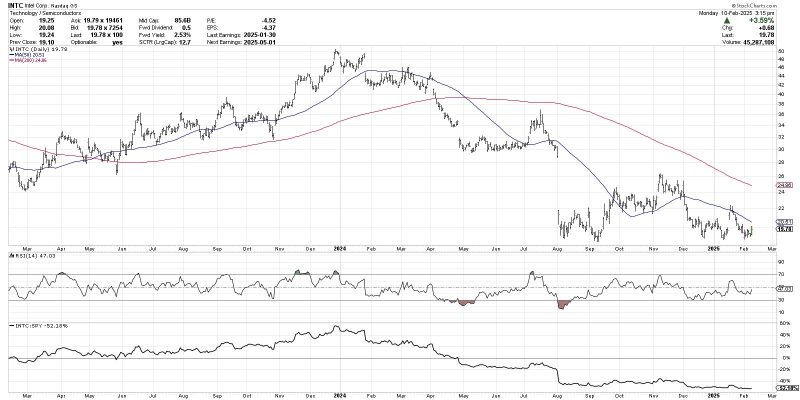 The chart of Intel Corp. (INTC) in early 2024 shows how a stock can rotate from a period of accumulation to a period of distribution. In late 2023, INTC was making higher highs and higher lows, the price above two upward-sloping moving averages. The RSI was mostly above the 40 level, representing a bullish range for this momentum indicator. The relative strength (bottom panel) was steadily trending higher, demonstrating that INTC was outperforming the S&P 500.