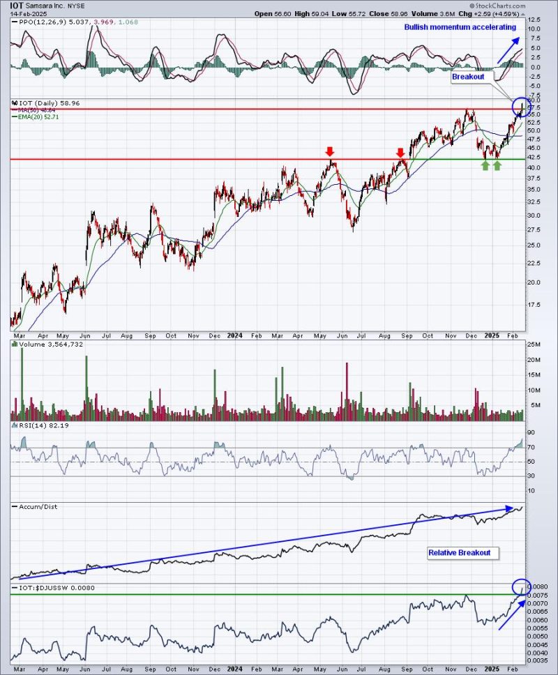 There are plenty of stocks to choose from in software ($DJUSSW), so IOT may or may not make our final cut. However, the strength here, both absolute and relative, is apparent. We just saw both the absolute and relative price break out to all-time highs. So too did the AD line. The uptrend is alive and kicking, if not strengthening. IOT will be reporting its quarterly results on March 6th, which is only a couple weeks after our portfolio “draft”. Having earnings so close can be a really good thing or a really bad thing. Currently, IOT’s significant relative strength vs. software suggests to me that the most recent quarter has been a very strong one, which could propel IOT substantially higher very quickly when results are released, helping to lead a portfolio higher. But what if IOT misses its estimates or lowers future guidance? We have a history of holding our portfolio stocks for an entire 90-day period without stops. Of course, our EB members can decide on their own how to handle both gaps to the upside or to the downside as a result of quarterly results. But holding a stock for 90 days after lowering guidance can be dangerous.