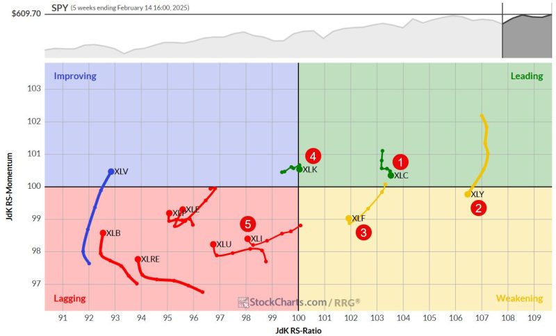 Industrials are living up to our expectations as the weakest link in the top five. It’s dropped from #4 to #5, thanks to continued weakness in relative strength. The RRG lines point lower, suggesting it’s only a matter of time before XLI drops out of the top five. Price-wise, we’re still within the rising channel, but a lower high has formed — not a great sign. Support comes in around $134 (rising support line) and $132-130 (late December low). A break below these levels could trigger a more significant decline.