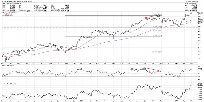 Over the last six weeks, ICE has reversed course and now sits above two upward-sloping moving averages as it has achieved a new all-time high. The bottom panel provides a fantastic reminder of the value of buying strong charts after they have pulled back to potential support levels, and also shows the impressive outperformance ICE has experienced in 2025.