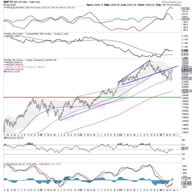 The coming week is shortened, with Thursday being a trading holiday due to Maharashtra Day. We could write about more than one thing that the markets could be worried about over the coming days. It could be the lowered growth forecasts by the IMF that include India and other economies; it could also be the heightened possibility of escalating geopolitical tensions between India and Pakistan. However, all that said, the markets are also at a crucial technical juncture. The Nifty has closed just at the 200-DMA placed at 24050. Besides this, Index has also defended the 50-week MA at 23925. This makes the 23,900-24,050 zone a crucial support area for the Nifty. The consolidation is imminent as the Nifty has rebounded over 11% from its April 07 lows, and minor corrective retracements cannot be ruled out. However, if 23900 is breached, the markets may see some extended retracements.