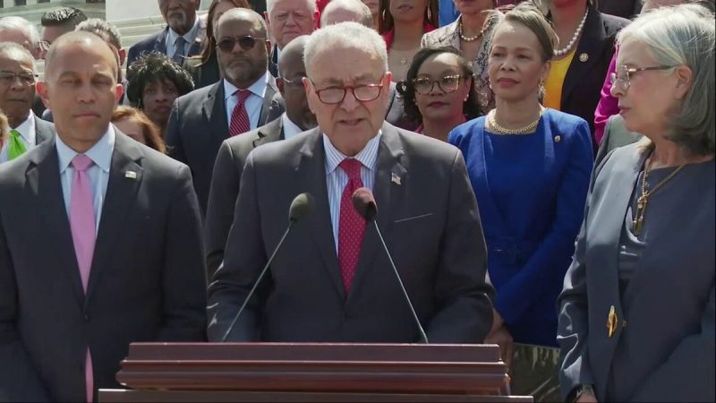 Senate Minority Leader Chuck Schumer, D-N.Y., and dozens of his bicameral colleagues addressed reporters on the Capitol steps Wednesday, blasting President Donald Trump’s first 100 days.