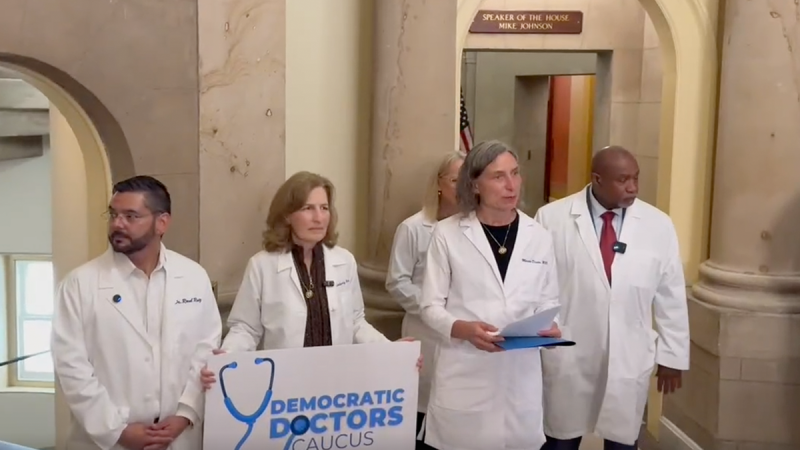 Apparently noticing the large gaggle of reporters staking out Johnson’s office amid last-minute member holdout negotiations, the caucus moved their press conference to right outside the speaker’s office. Donning their white coats in the crowded hallway, the Democratic doctors began their prepared remarks.